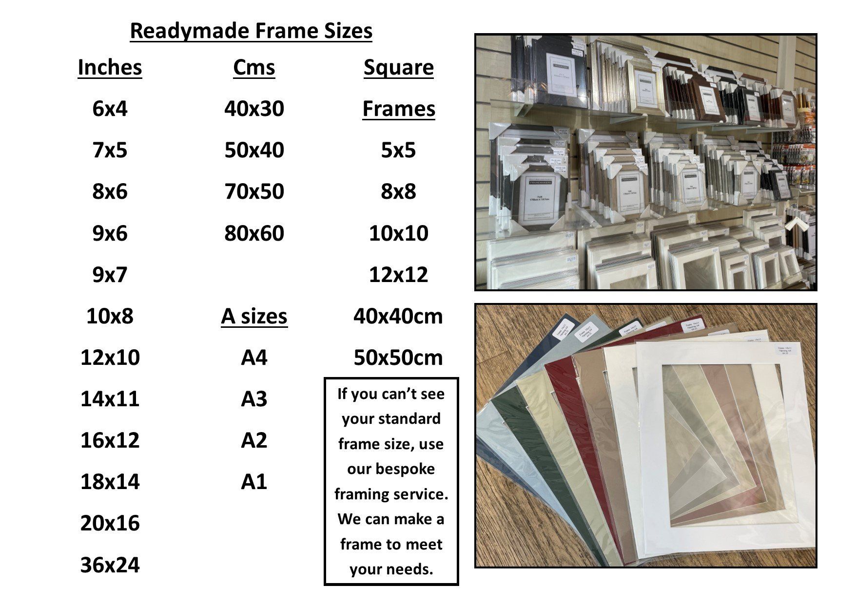 We carry a large selection of styles and sizes of Ready Made Frames and Bevel Cut Mounts in standard sizes. These are available in our Marlborough Gallery. Our Ready Made Frames are crafted by us from quality wooden frames.